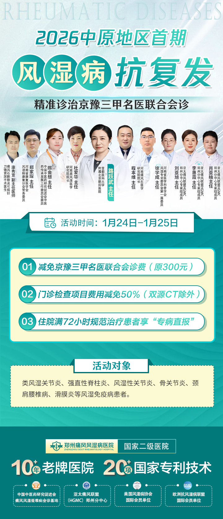 对于痛风风湿病的治疗,规范的临床诊治固然重要,而系统、科学的抗复发管理同样关键。定期复查、持续治疗与合理用药,尤其是在临床治愈后的前3-5年,坚持每年接受专业的抗复发管理,对减少病情反复、争取长期稳定乃至实现不复发,具有重要意义。为此,河南省康复医学会风湿病分会康复临床基地——郑州痛风风湿病医院,将于2026年1月24日至25日举办 “2026中原地区首期痛风风湿病抗复发精准诊治京豫三甲名医联合会诊”。活动特邀北京、河南两地三甲名医,携手开展联合会诊,推动抗复发精准诊疗,帮助患者从根源控制病情,避免反复发作带来的身心困扰。